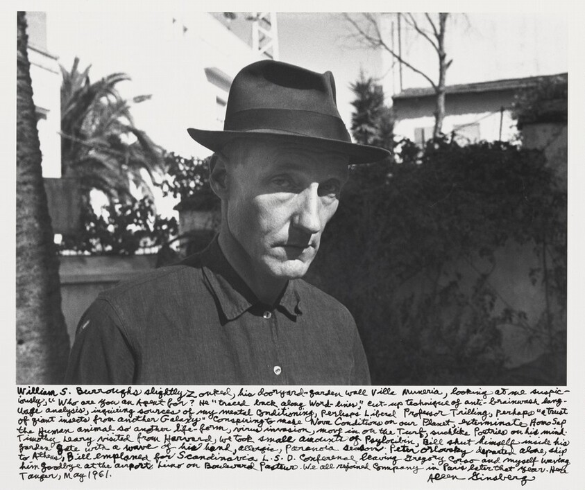 William S. Burroughs slightly zonked, his dooryard-garden wall Villa Muneria, looking at me suspiciously, "Who are you an Agent for?" He "traced back along word-lines," cut-up technique of anti-brainwash language analysis, inquiring sources of my mental conditioning, perhaps Liberal Professor Trilling, perhaps "a trust of giant insects from another Galaxy" conspiring to make Nova Conditions on our Planet, exterminate HomoSap the Human animal so another life-form, virus invasion, move in on the Turf, such like poetries on his mind. Timothy Leary visited from Harvard, we took small amount of psilocybin, Bill shut himself inside his garden gate with a wave of his hand, allergic, paranoia season. Peter Orlovsky departed alone, ship to Athens, Bill employed for Scandinavia L.S.O. Conference leaving Gregory Corso and myself waving him goodbye by Ginsberg, Allen, Davis, Gary S. — VisualArtsDB