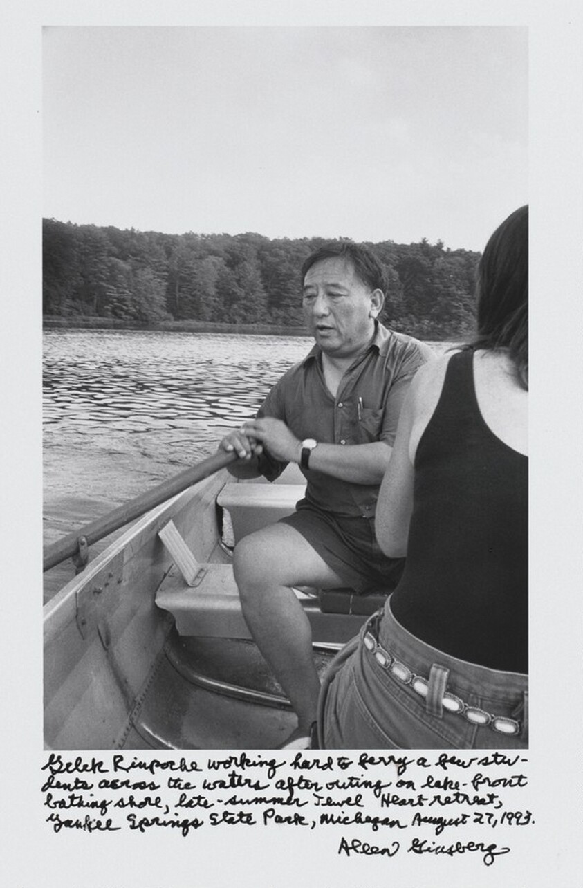 Gelek Rimpoche working hard to ferry a few students across the waters after outing on lake-front bathing shore, late-summer Jewel Heart retreat, Yankee Springs State Park, Michigan August 27, 1993. by Ginsberg, Allen, Davis, Gary S. — VisualArtsDB