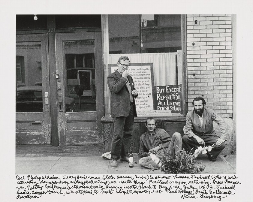 Poet Philip Whalen, Jerry Heiserman (later Hassan, Sufi) & student Thomas Jackrell (who'd writ interesting document-poem on Campbell's Soup) en route thru Portland Oregon returning from Vancouver Poetry Conference (with Olson Creeley Duncan Levertov) back to Bay Area, July 1963. Jackrell had a camper truck, we stopped to visit Lloyd Reynolds at Reed College, drink Buttermilk downtown. by Ginsberg, Allen, Davis, Gary S. — VisualArtsDB