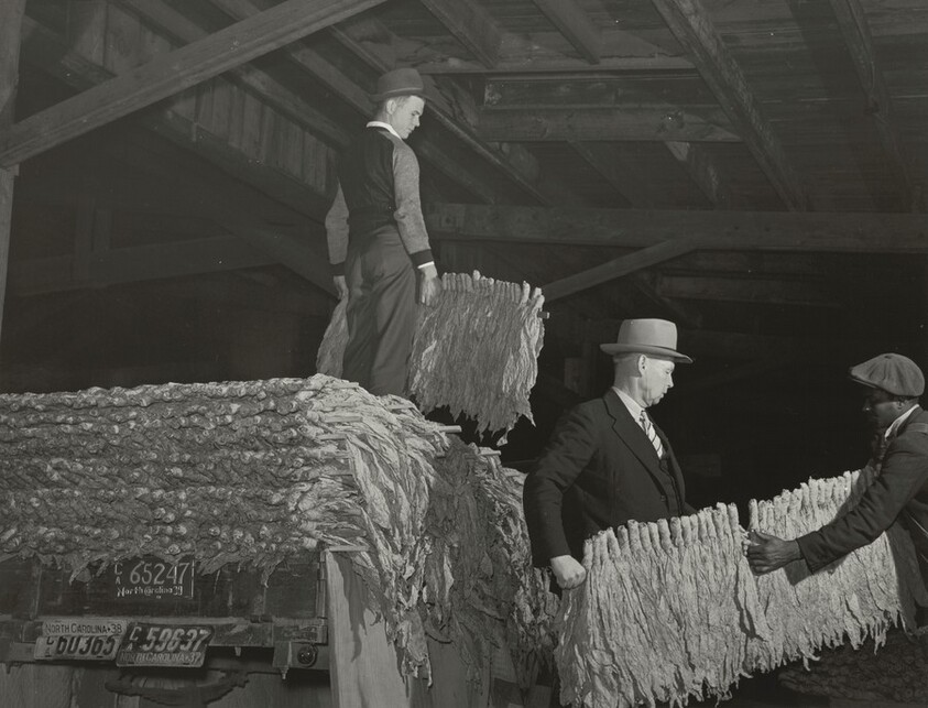Unloading tobacco from trailer into baskets according to the grade, the night before auction sale in warehouse, Durham, North Carolina by National Gallery of Art, UBS Art Collection, Marion Post Wolcott — VisualArtsDB