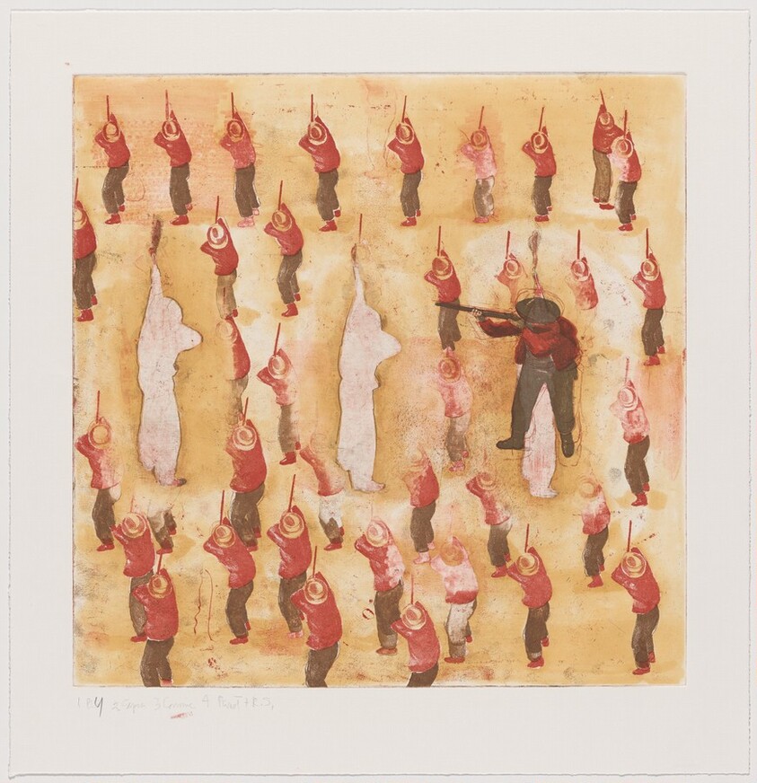 - color aquatint with soap ground and spit bite aquatints, soft ground etching and drypoint on Somerset paper (WP 14 – red and brown soft ground, yellow ochre spit bite background, three figures scraped out, one more added) [working proof 14]