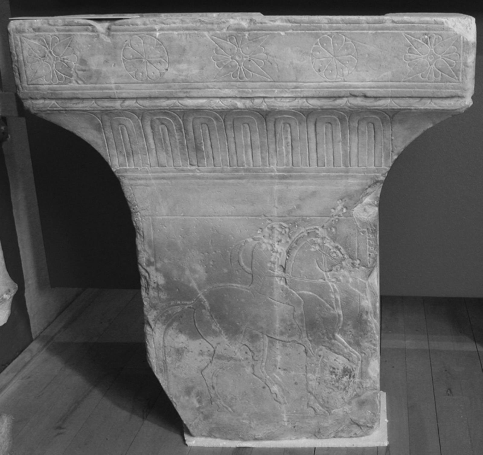 Kapitæl fra gravstele. Rytter, grædende kvinder og gammel mand by — VisualArtsDB
