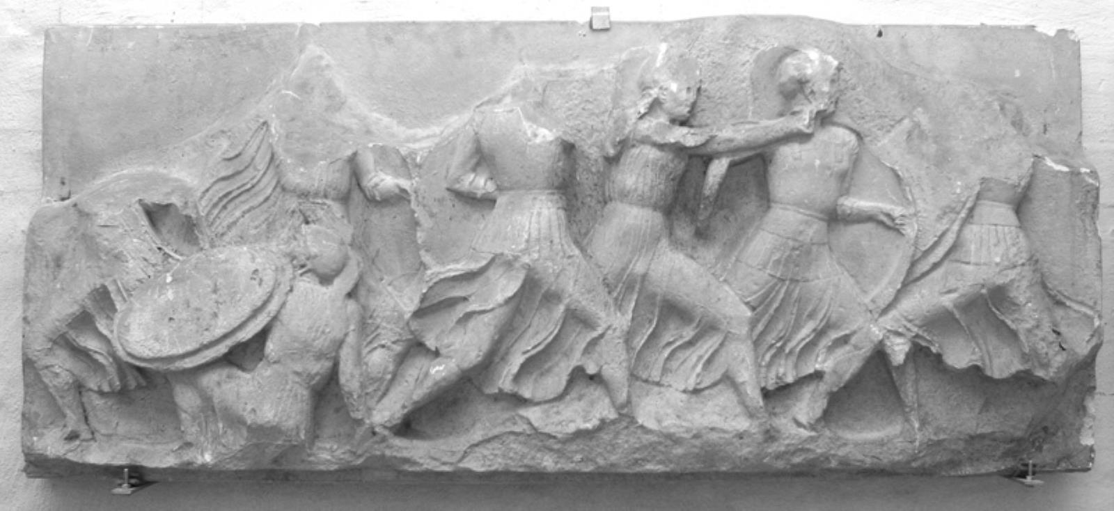 Kampscene med krigere mod venstre og højre by — VisualArtsDB