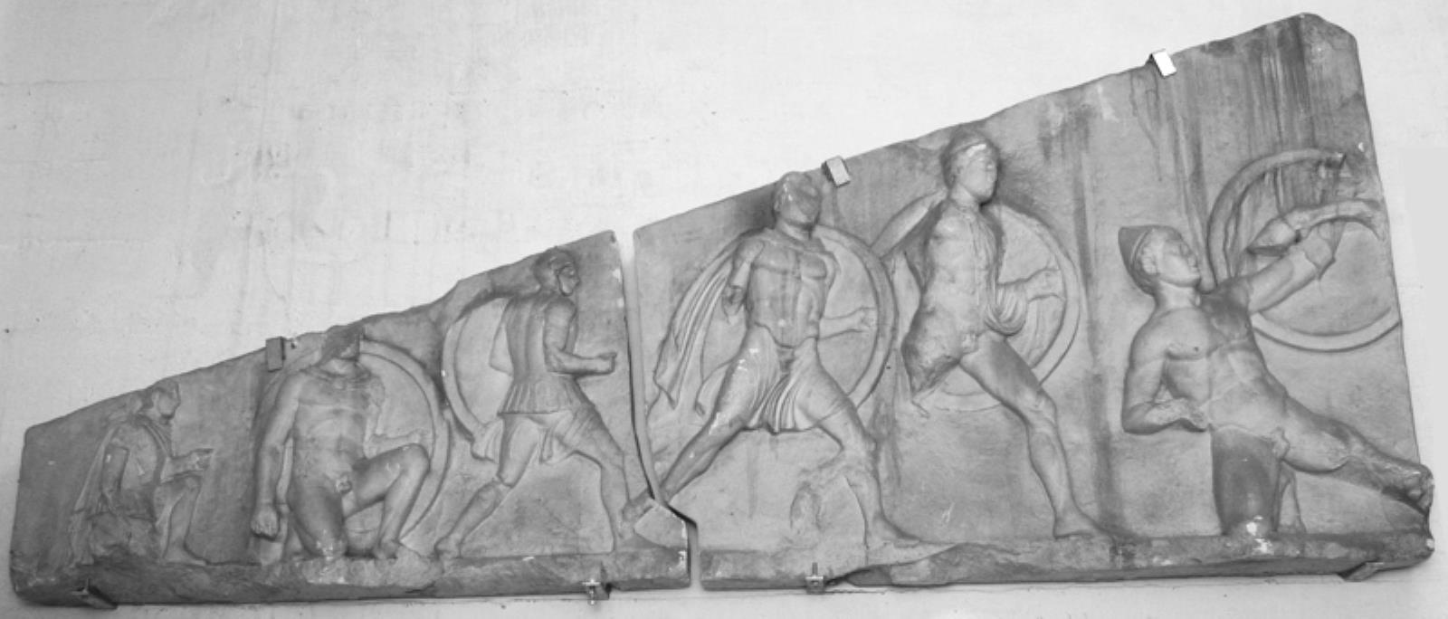 Seks krigere mod h., hvoraf den forreste knælende angribes af rytter (kun delvis bevaret)