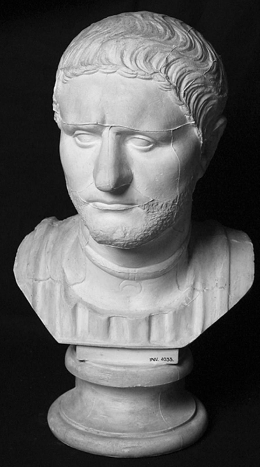 Mand med kortstudset fuldskæg og halsring med vedhæng, nok en romersk officer