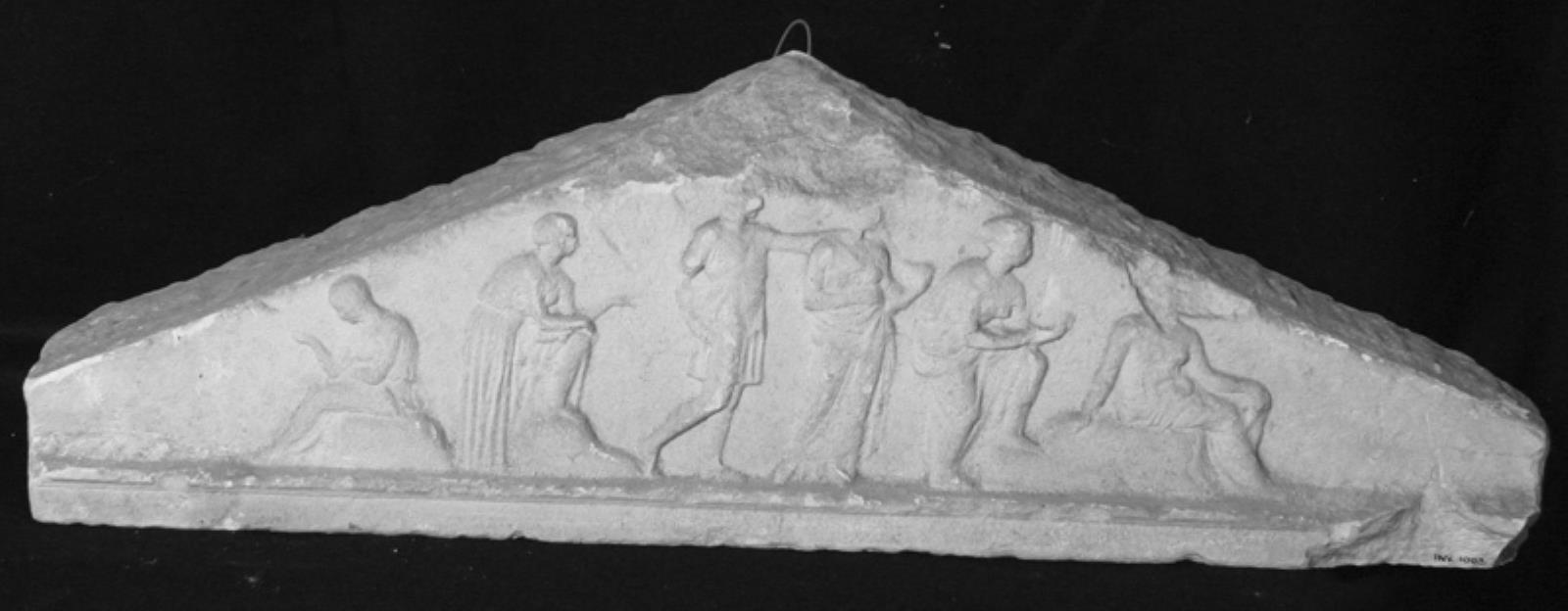 Gravrelief. Gravrelief i form af gavl. Stående mand, tre stående kvinder og to siddende personer by — VisualArtsDB