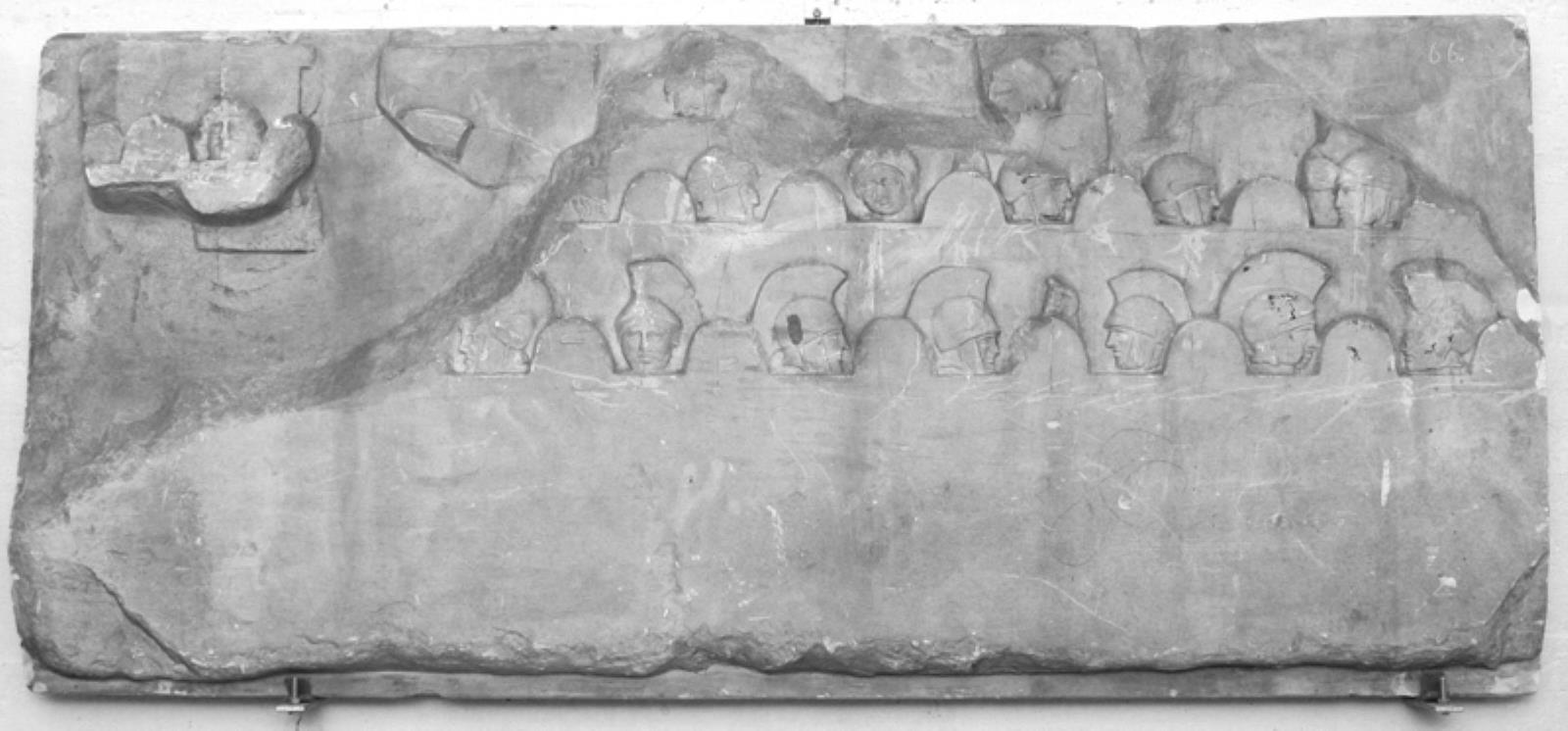 Bymure med forsvarernes hoveder mellem murtinderne by — VisualArtsDB