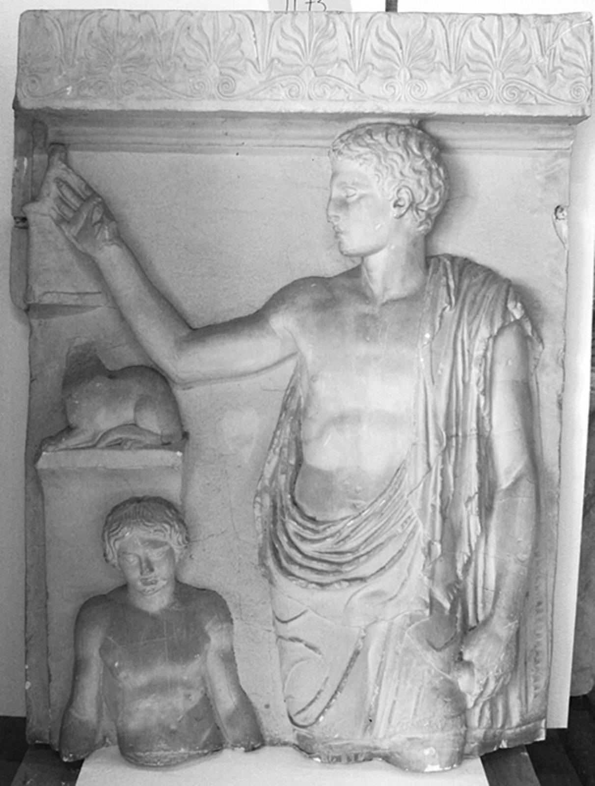 Gravrelief. Stående ung mand m. fugl i v. hånd, en dreng, stele med en kat by — VisualArtsDB