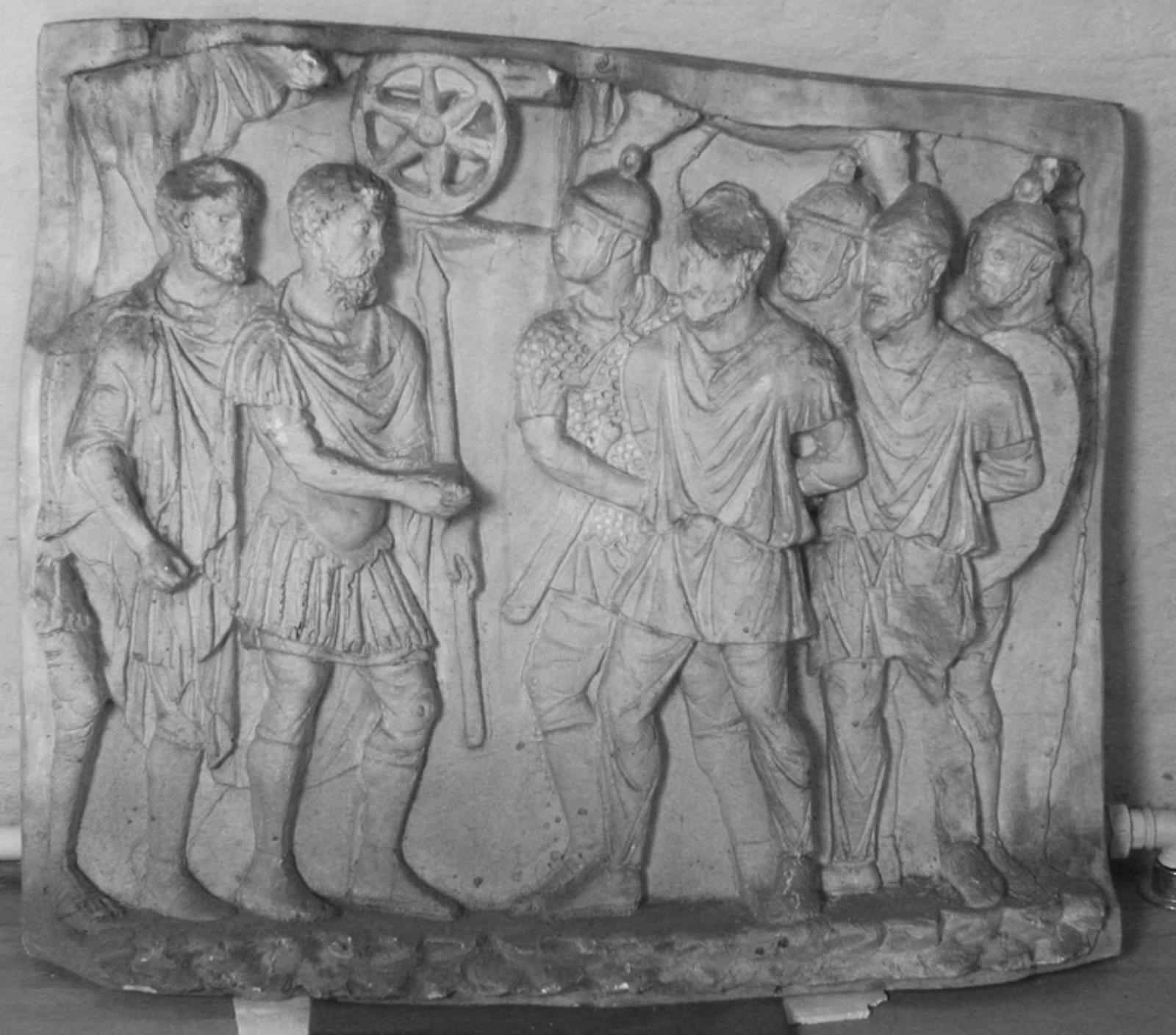 Tilfangetagne barbarer med konisk hovedbeklædning føres frem for Marcus Aurelius (og Pompeianus?) Kærrehjul ses ovenover. by — VisualArtsDB