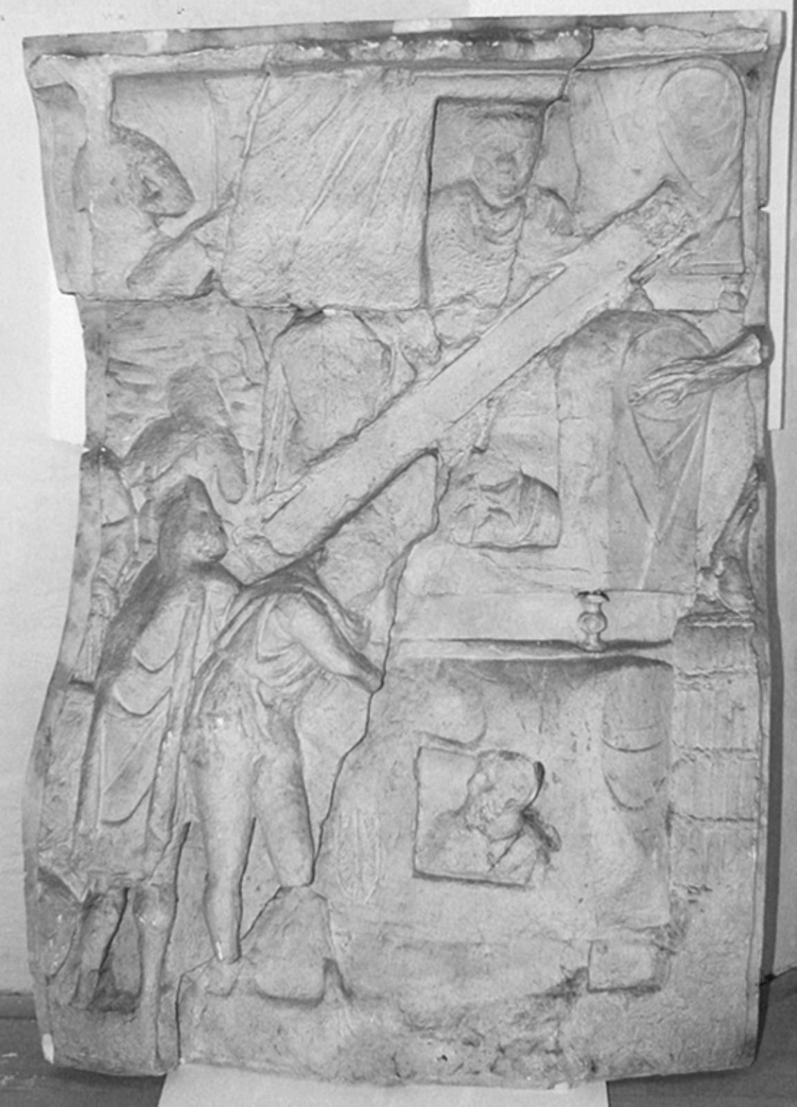 En gesandt i bærestol, nederst (Galenus?), den 14-årige Commodus (øverst), der modtog sin "Toga Virilis" i Marcus Aurelius' lejr år 175, i midten hans moder (ødelagt) Faustina
