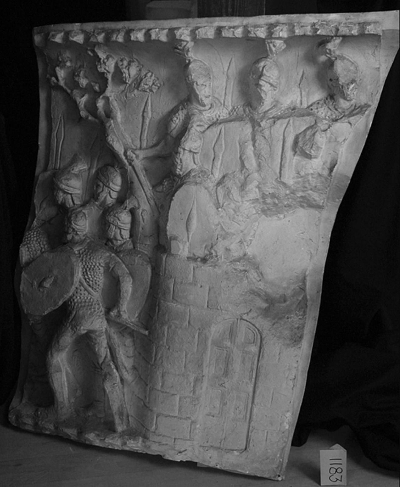 Romersk soldat stormer ud fra et fort, tre soldater ses over muren by — VisualArtsDB