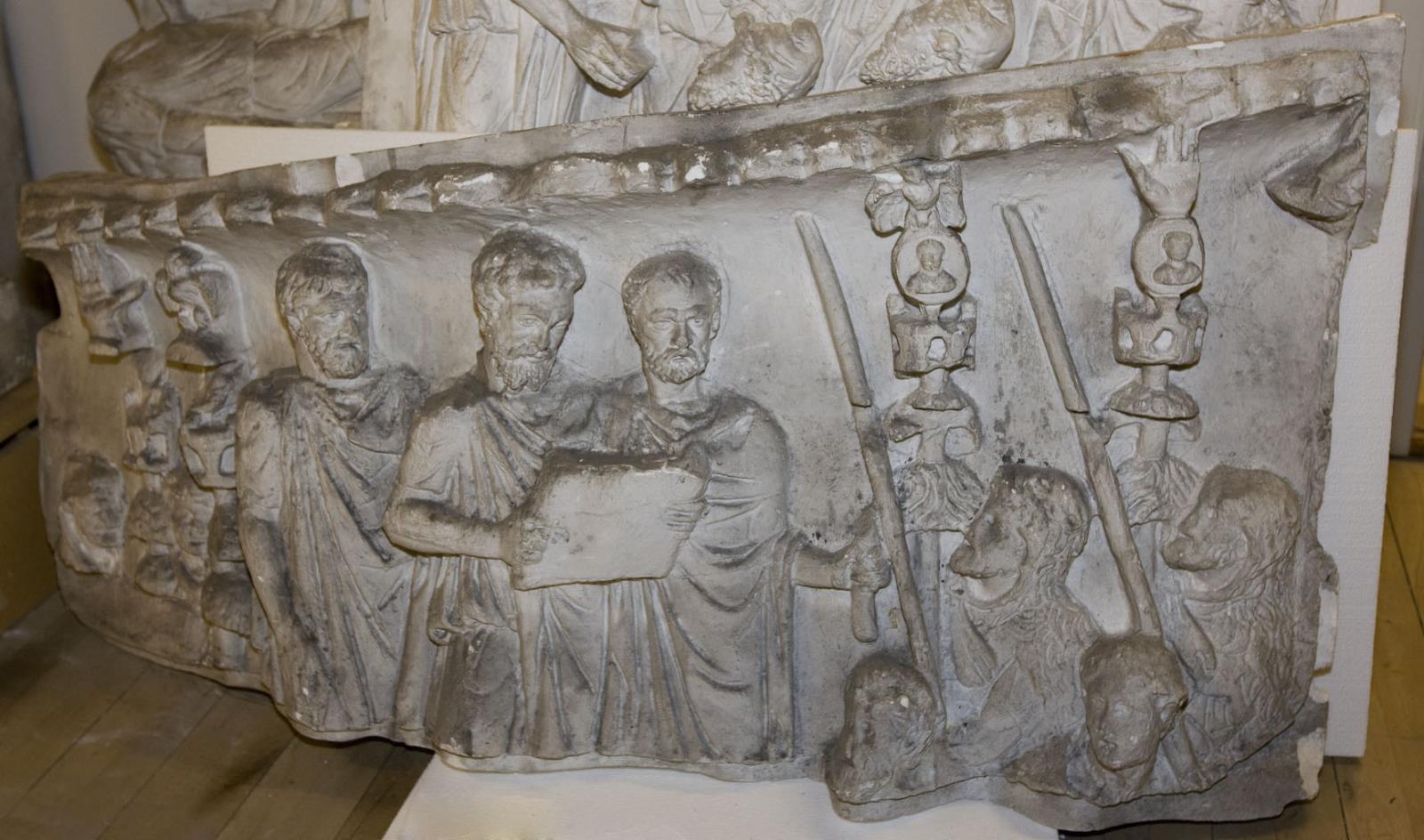 Øvre del. Marcus Aurelius taler til tropperne. Omkring ham står standartbærere og liktorer