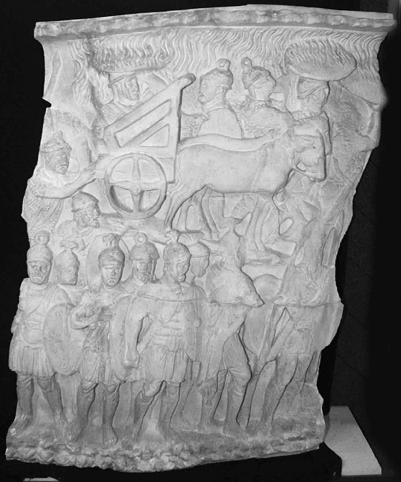 Regnunderet. Romerne reddes af regnen, der styrter ned over soldaterne og deres udstyr (en "ballista" på oksekærre). Nederst til højre ses kommandør Pertinax med ansigtet ud mod betragteren.