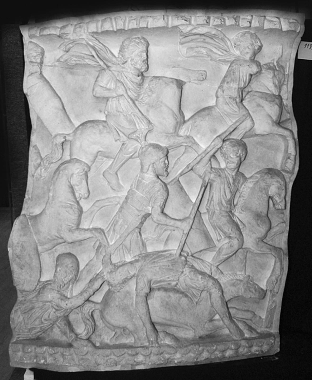Romere og barbarer kæmper til hest. To barbarer flygter, flere er dræbt by — VisualArtsDB