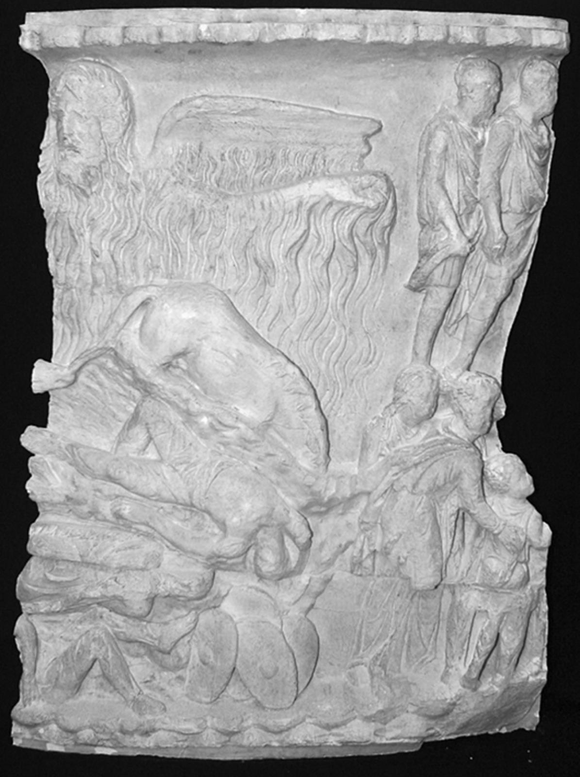 Regnunderet (central, skægget figur). Regnen skyller fjenderne med heste og våben bort. Undertvungne germanere t.h. by — VisualArtsDB