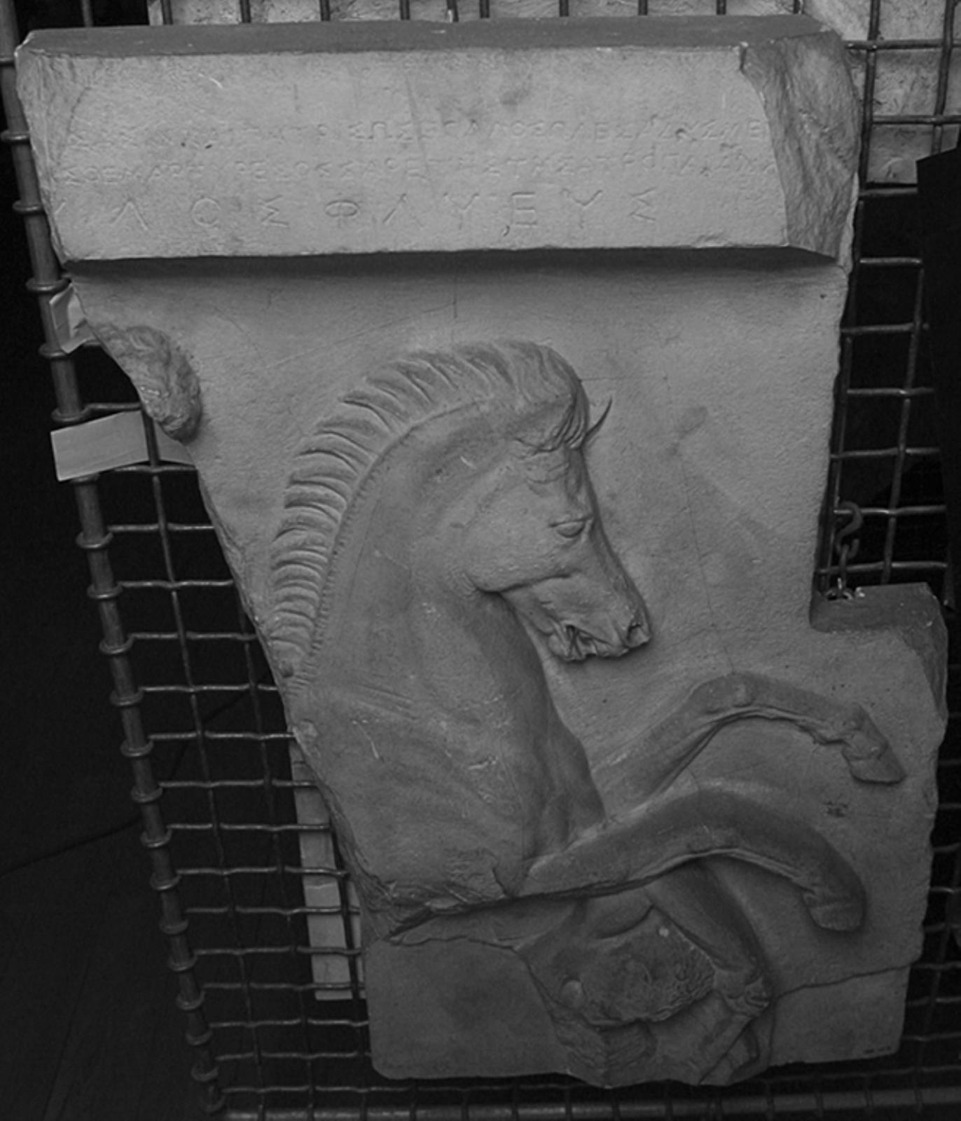 Gravrelief. Forparti af hest, parti af rytter og faldende modstander by — VisualArtsDB