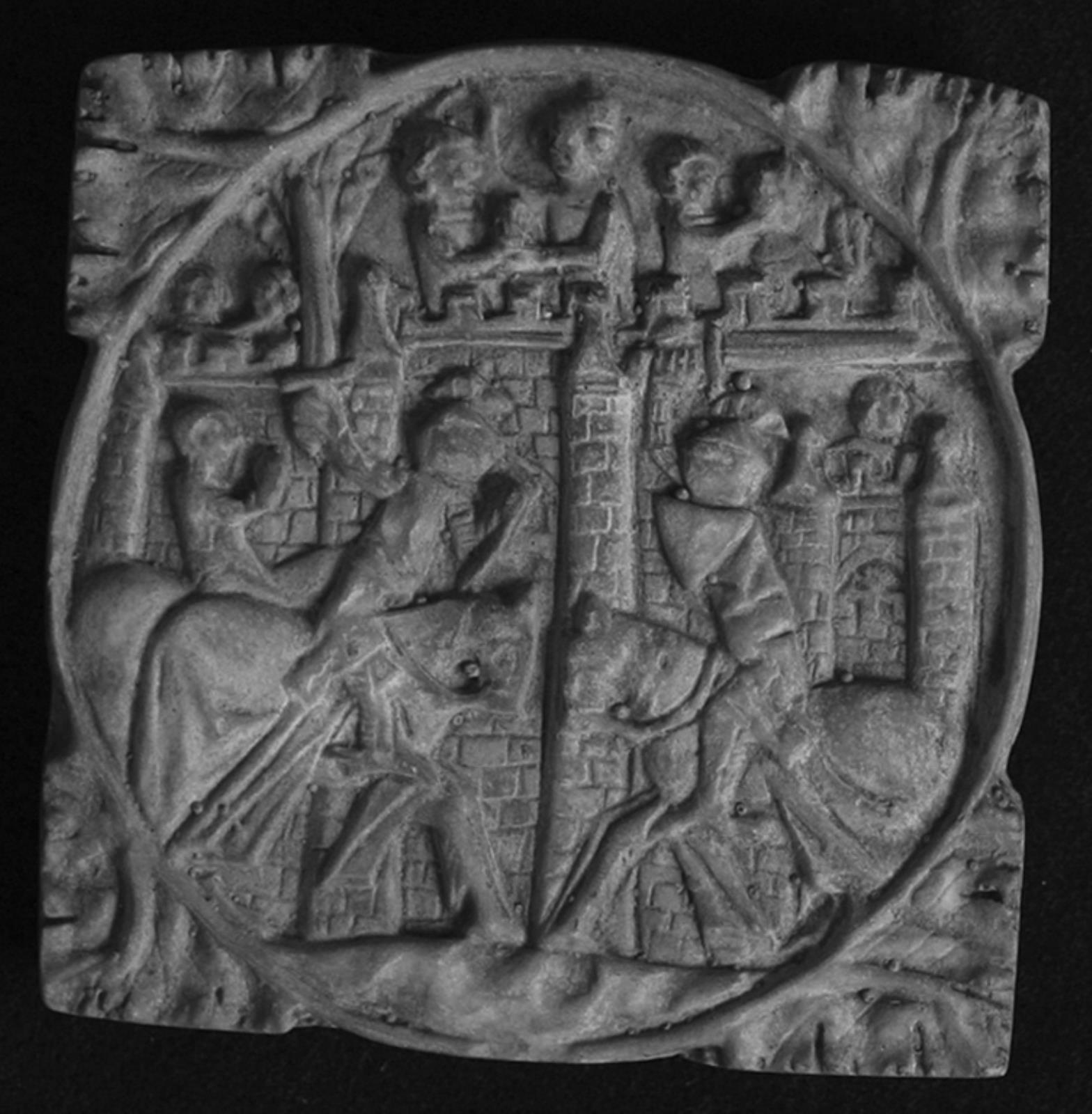 Kamp foran borg, deri forelsket par. Låg/forside by — VisualArtsDB