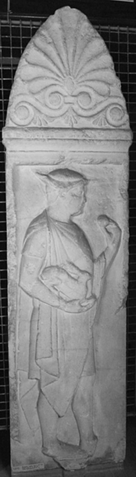 Gravrelief. Yngling stående mod h. med hare i h. hånd