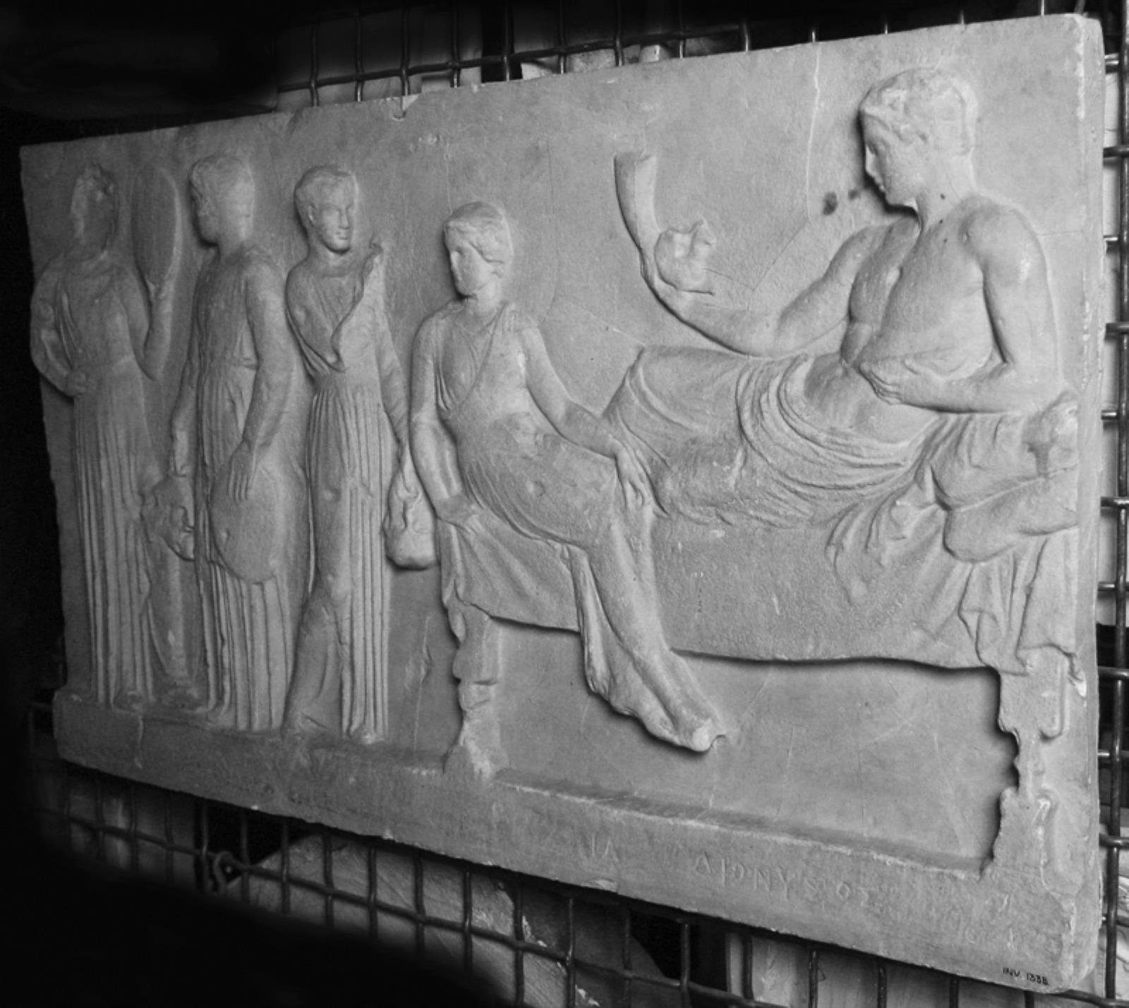 Votivrelief. Dionysos med drikkehorn, liggende mod v. Tv. kvinde og to mænd med teatermasker by — VisualArtsDB