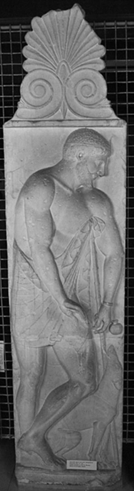 Gravrelief. Stående mand mod h. med hund, Borgiastelen by — VisualArtsDB