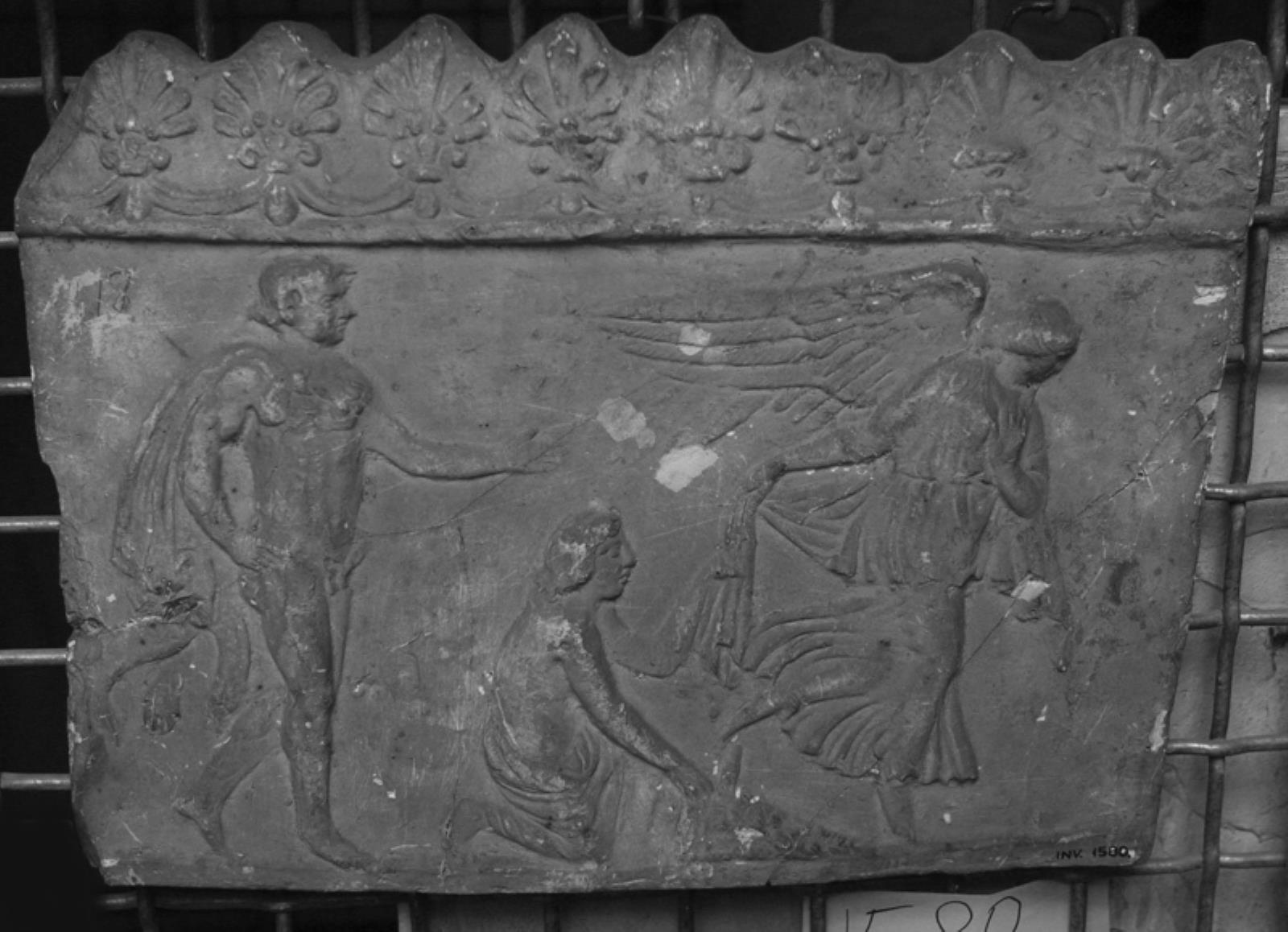 Silén, knælende kvinde ved kurv, th. en bortflyvende vinget kvinde