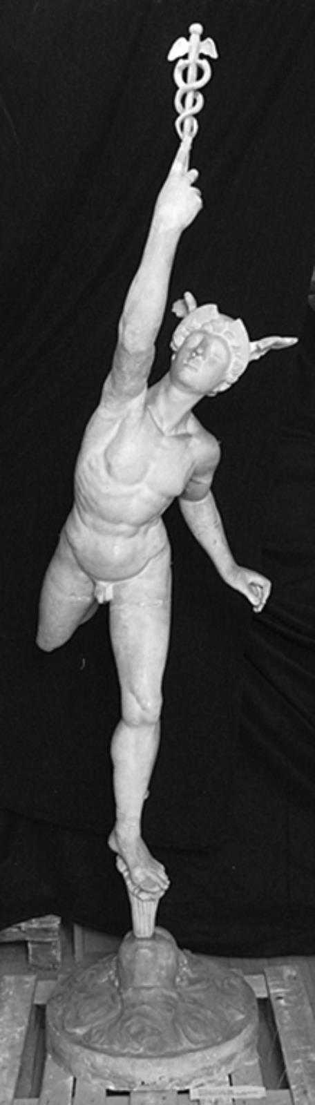 Merkur løbende, støtter på v. ben, som står på vindgudens ånde. Holder heroldstav i højt løftede h. hånd by — VisualArtsDB