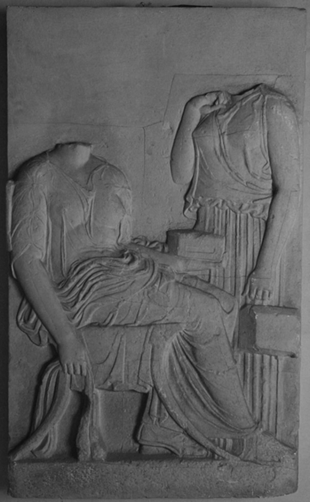 Gravrelief. Siddende kvinde med skrin og stående pige med skrin by — VisualArtsDB