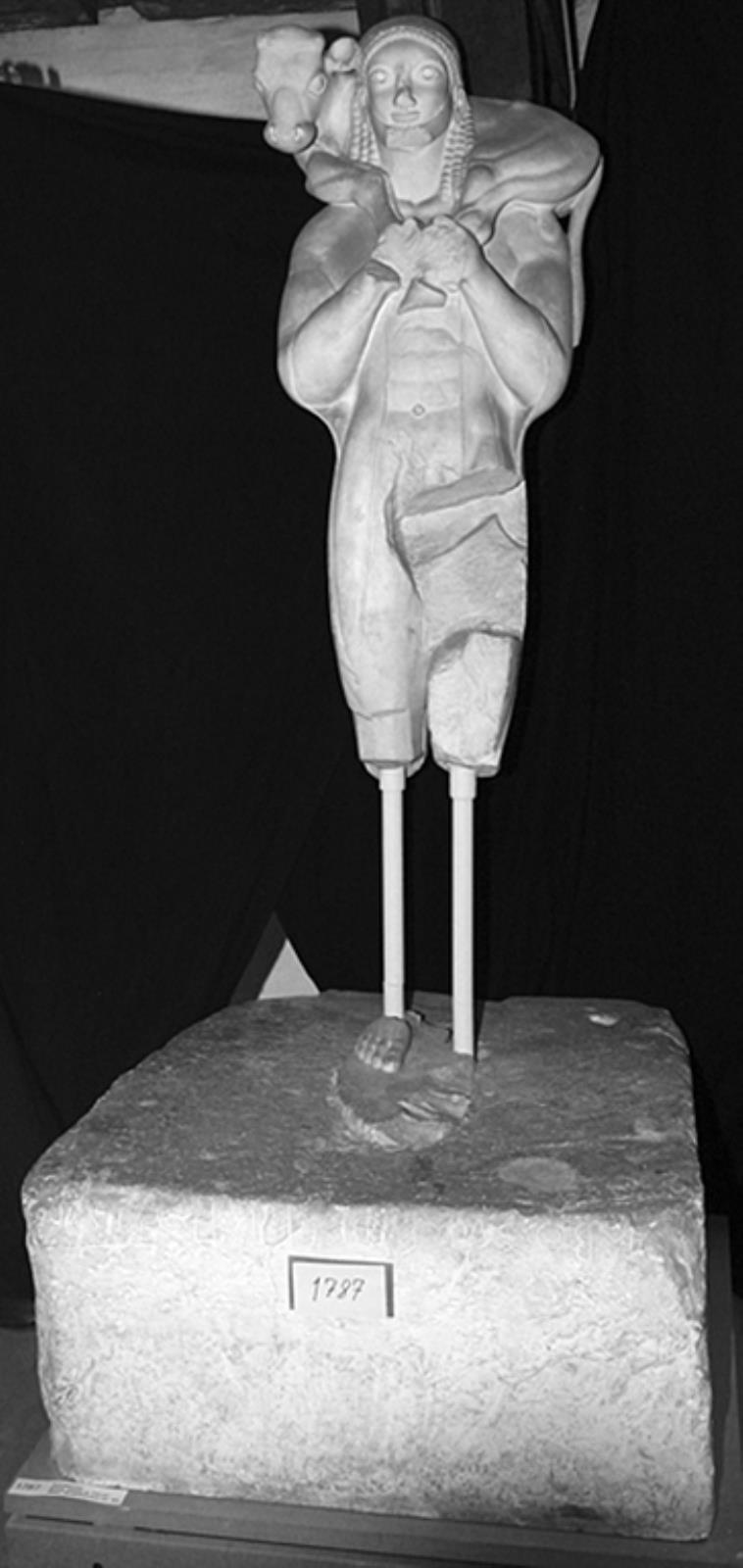 Ung mand, Kalvebæreren, på sokkel. Opstillet af Rhombos