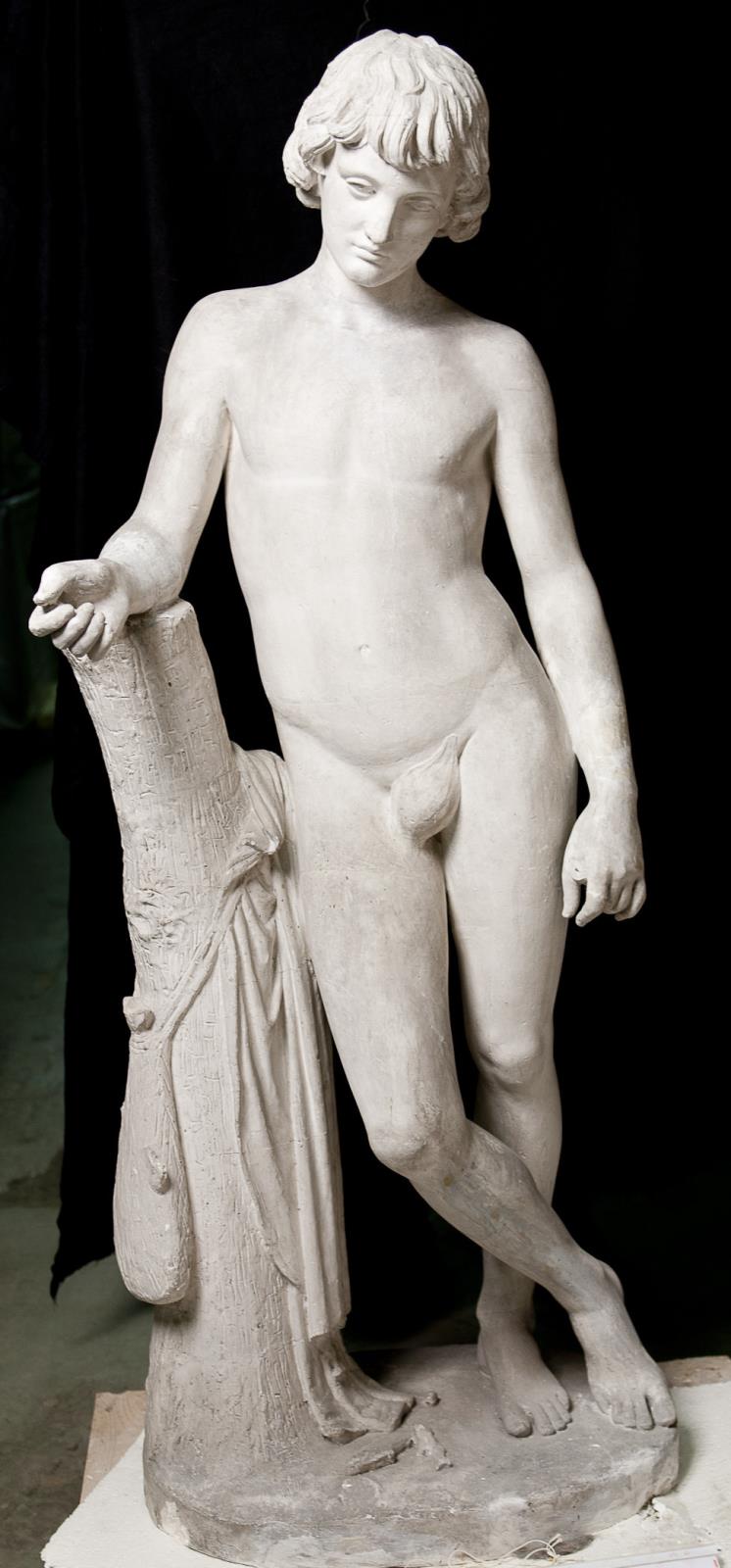 Fiskerdreng, nøgen, stående lænet til træstøtte ved højre side