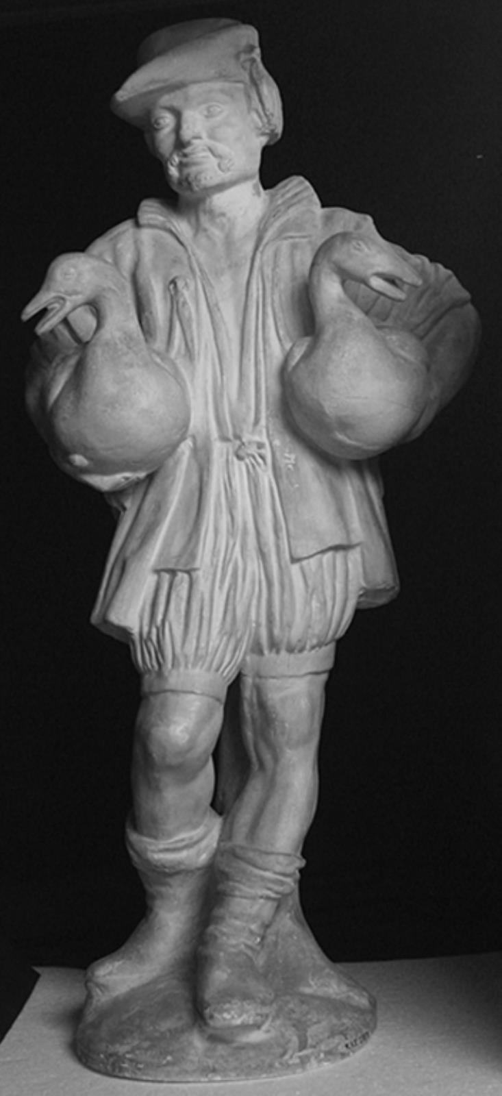 Fontænefigur. Bonde stående med to gæs under armene by — VisualArtsDB
