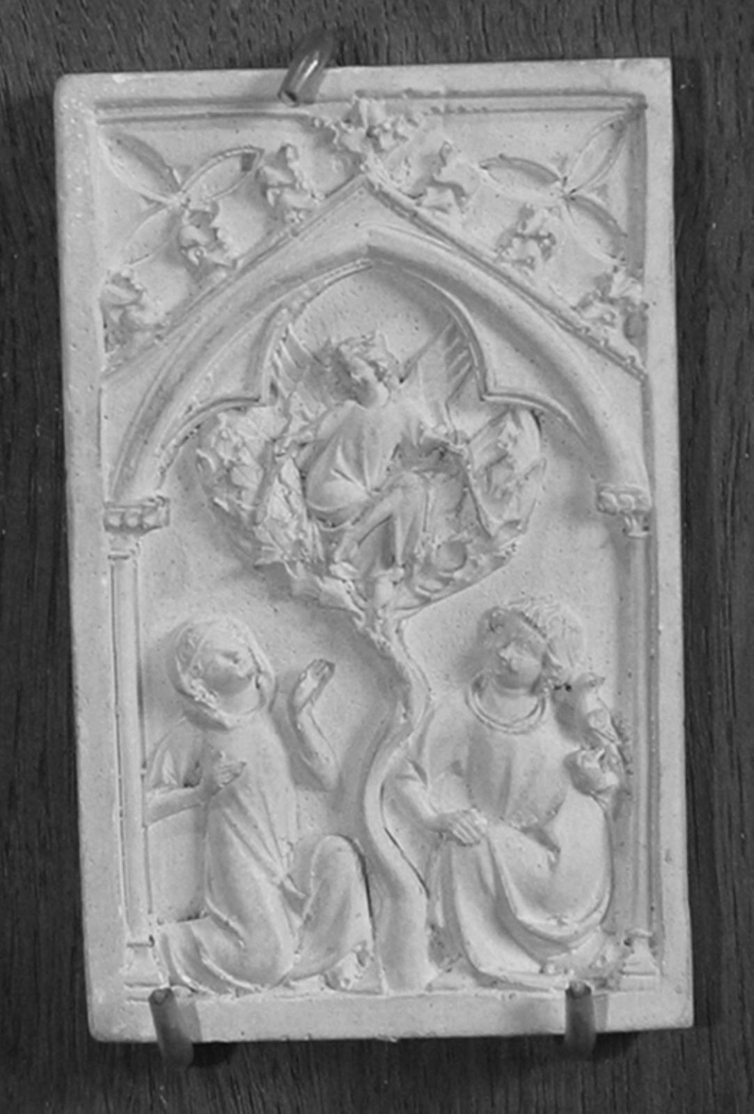 Udskåret på begge sider. Yngling og dame knæler ved træ by — VisualArtsDB