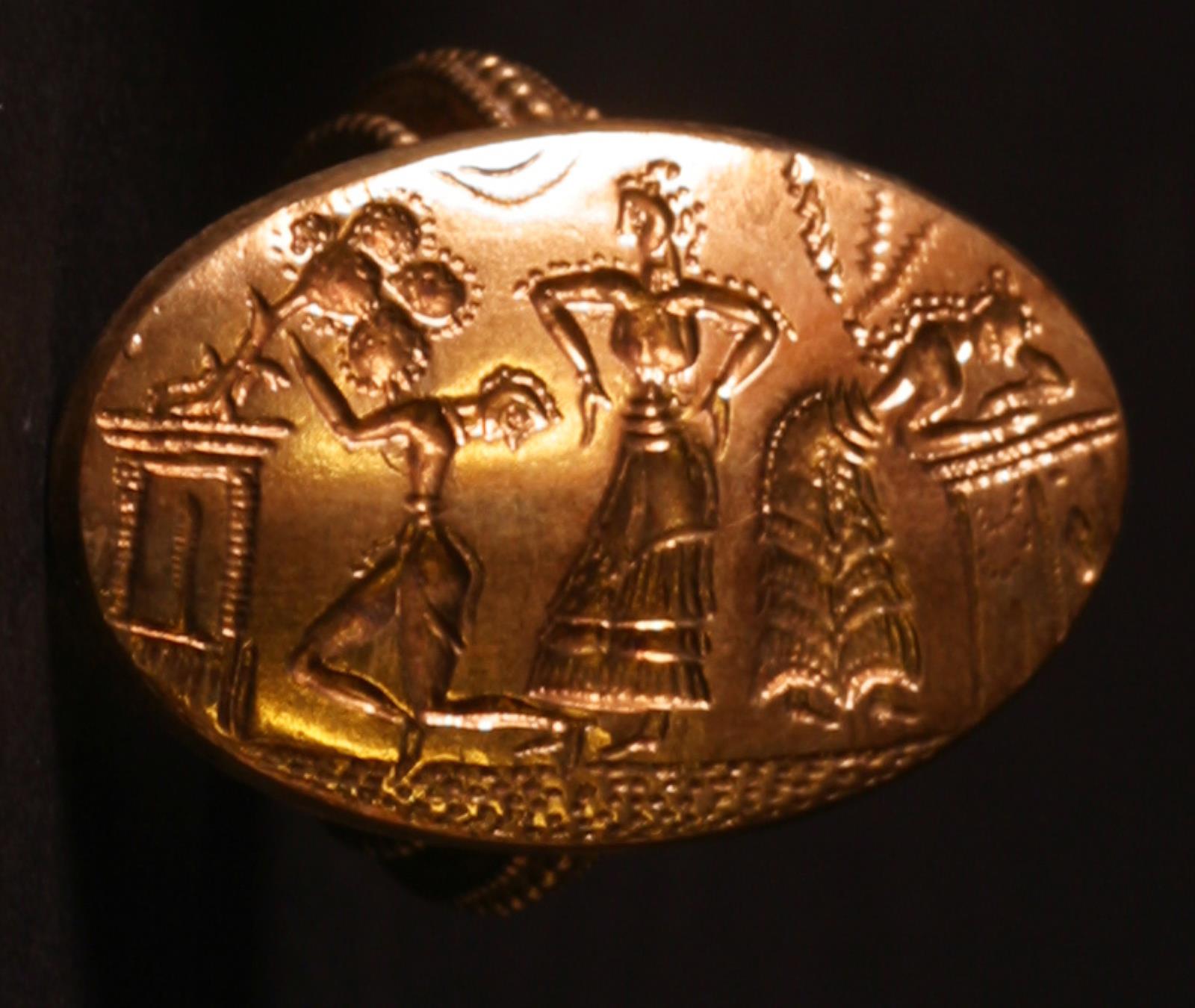 Signetring. Oval. Stående kvinde, knælende mand og kvinde der bukker sig fremover by — VisualArtsDB