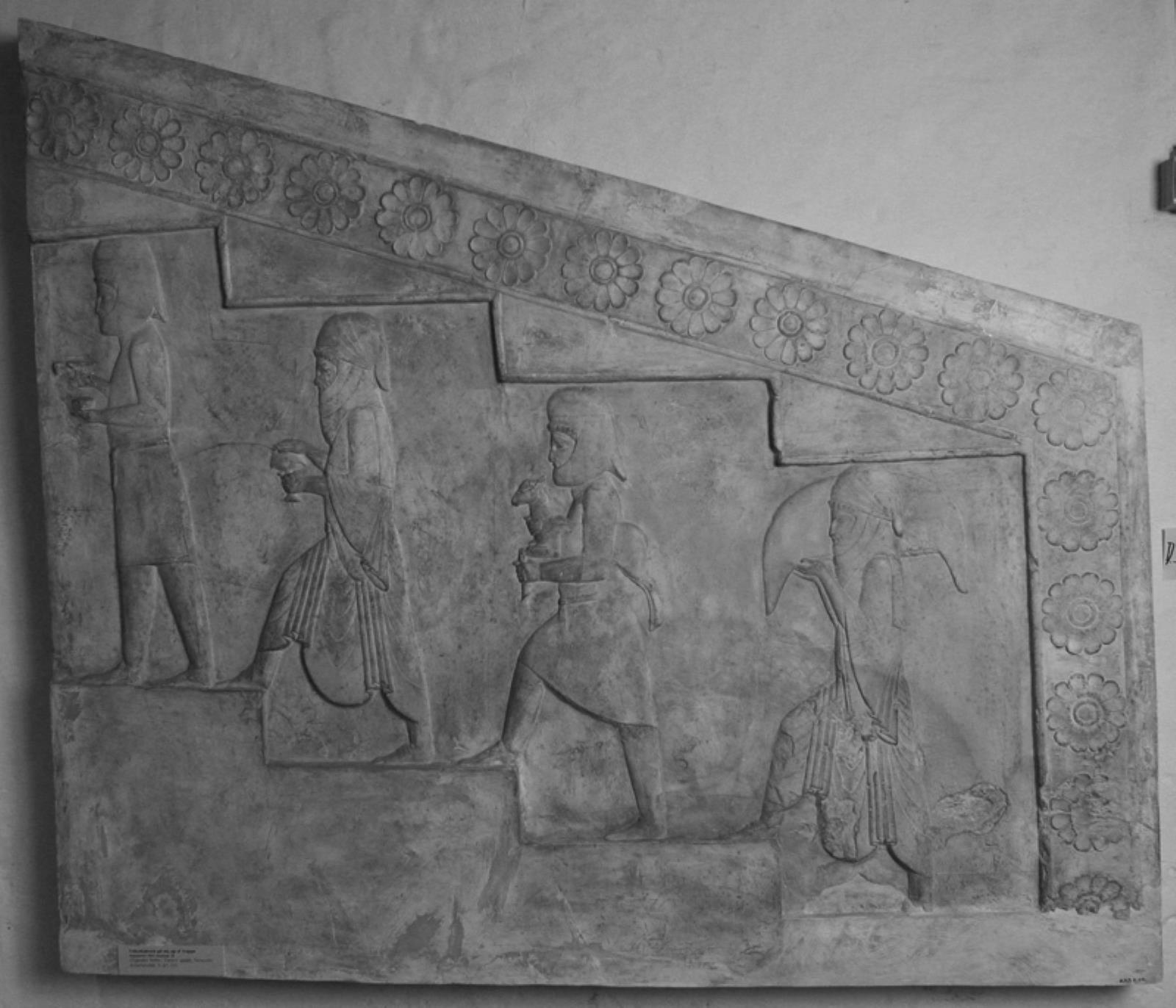 Tributbærere mod venstre på vej op af trappe. Foroven og til højre rosettebånd by — VisualArtsDB