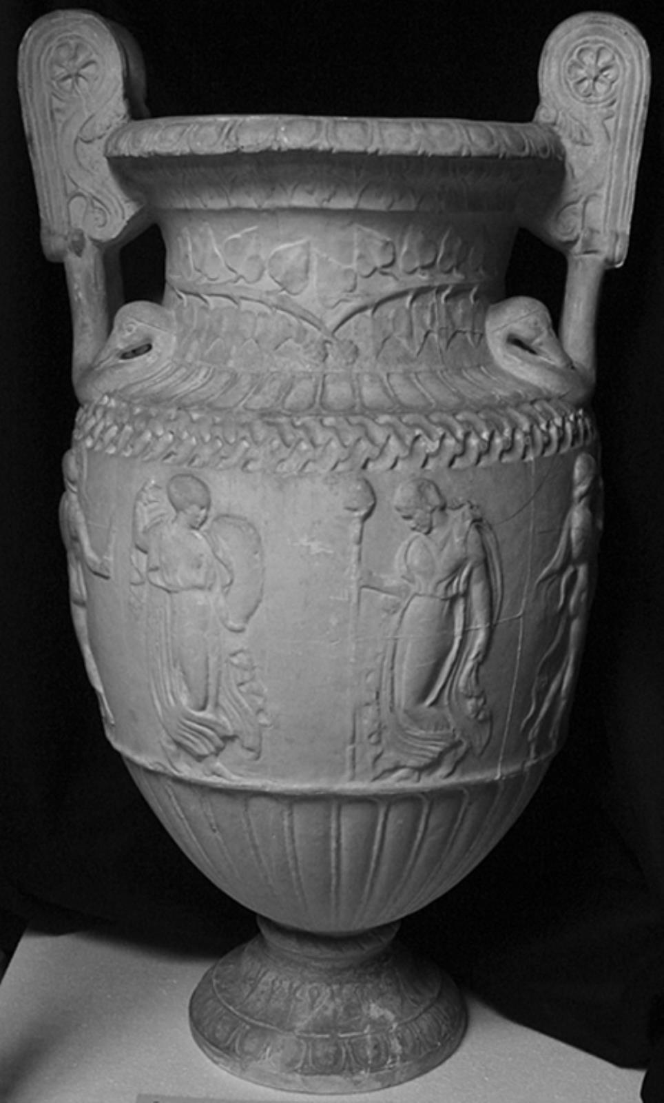 Amfora (volut-krater). Hermes og Artemis ved alter, dansende satyr, mænader og våbendanser by — VisualArtsDB