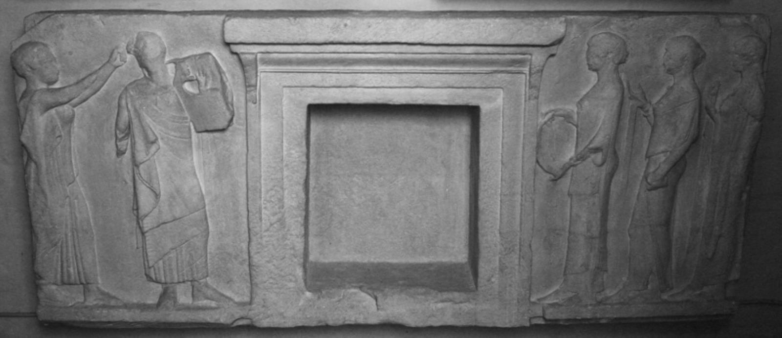 Kultniche. Til venstre krones Apollon af en muse(?), til højre tre nymfer