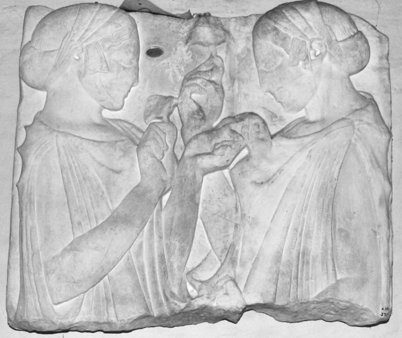 Gravrelief. To kvinder i profil mod hinanden med blomster i hænderne by — VisualArtsDB