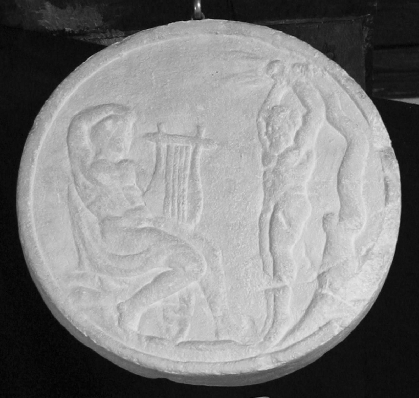 Skive med relief på begge sider, Marsyas straffes foran Apollon, dansende satyr by — VisualArtsDB