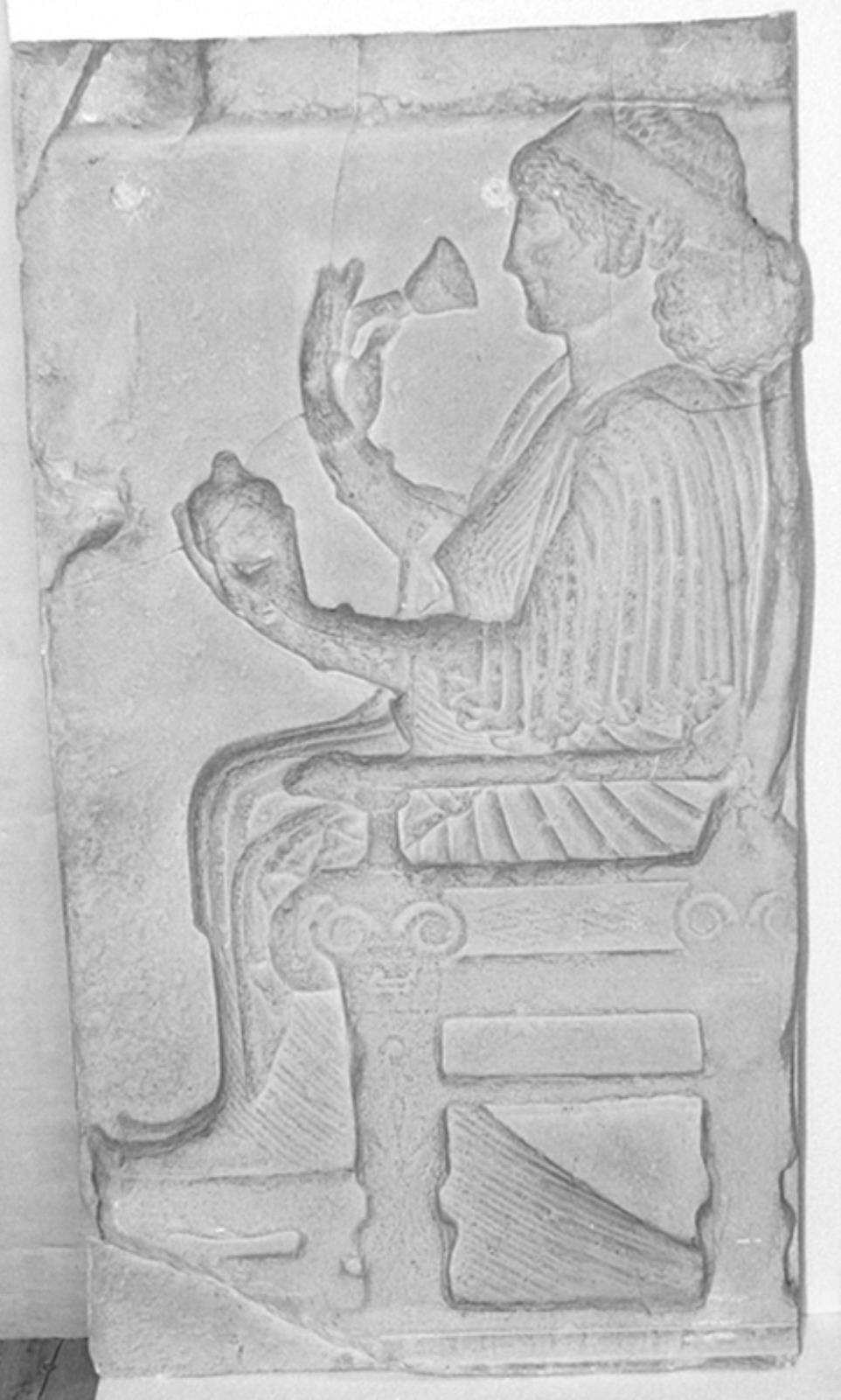 Siddende mand og stående kriger overfor hinanden flankeret af sirener by — VisualArtsDB