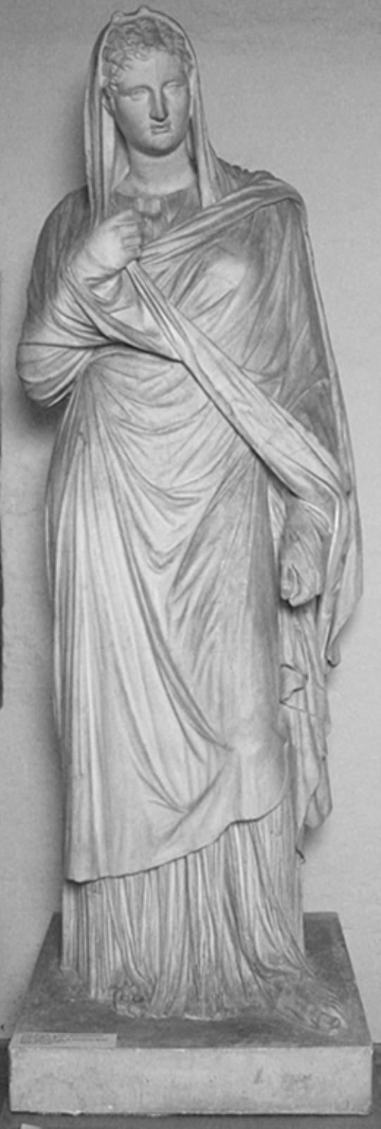 Stående kvinde iført chiton og kappe, som ligger op over hovedet, Store Herkulanerinde by — VisualArtsDB