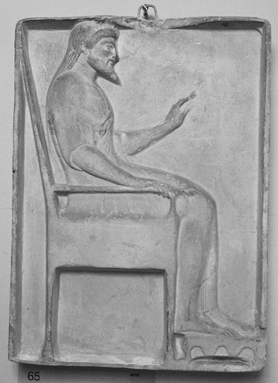 Votivrelief. Tronende skægget mand mod højre by — VisualArtsDB