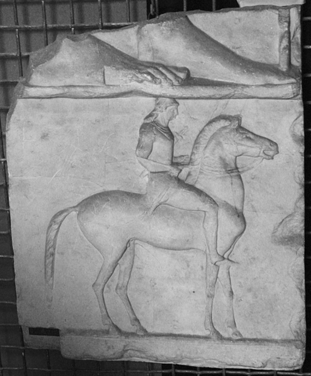Nedre del af gravstele. Rytter mod højre, herover to nøgne fødder mod højre by — VisualArtsDB