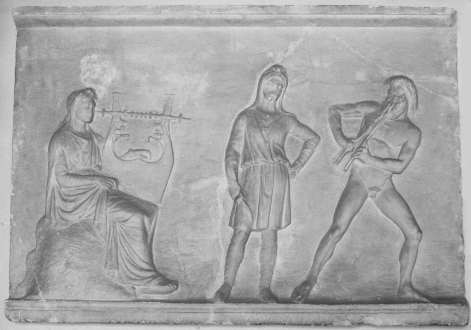 Relief fra statuebase. Stående skytisk slave mellem Apollon og Marsyas med fløjte by — VisualArtsDB