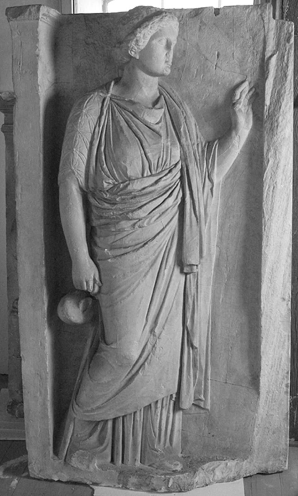 Gravrelief. Stående kvinde mod højre med en lille hydria i højre hånd