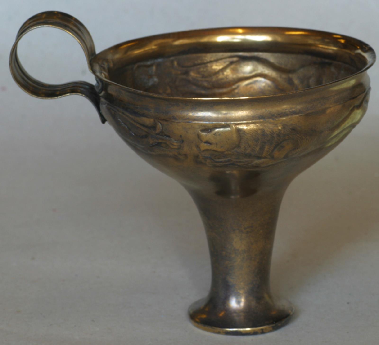 Bæger med hank. Tragtformet. Dekoreret med løver i lavt relief