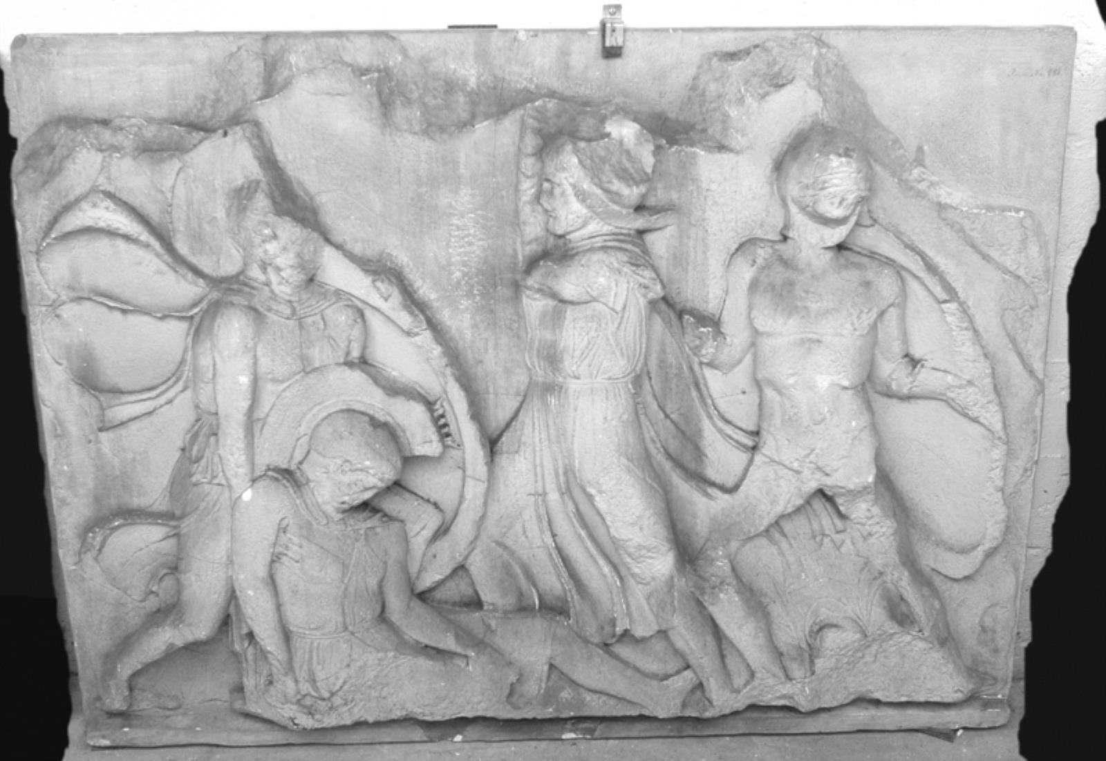Til venstre hjælpes en såret, siddende kriger af en kammerat, en persiskklædt, en nøgen græker by — VisualArtsDB