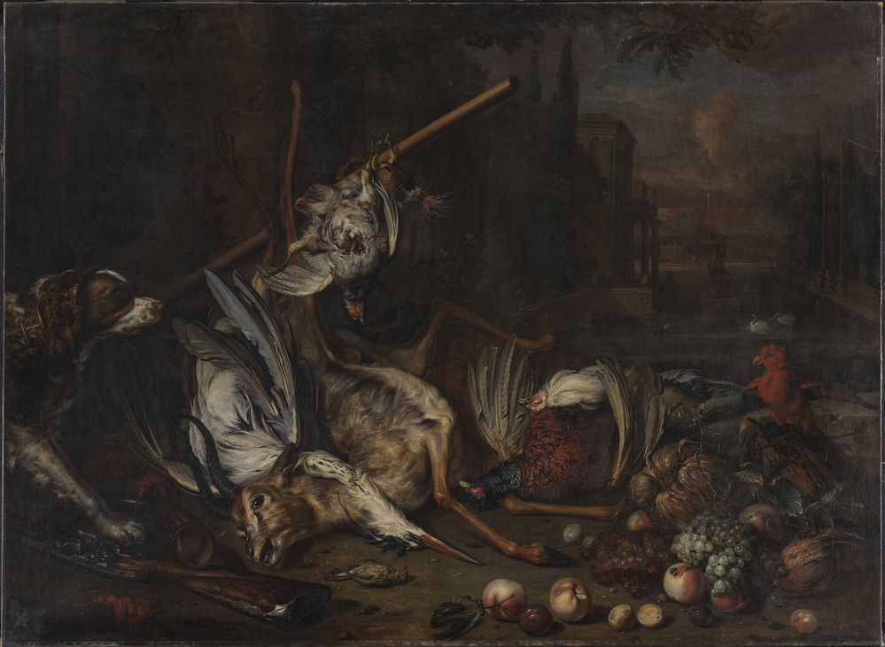 Stilleben med en død gazelle, hejre og andet fjerkræ, med en hund, papegøje, riffel og kokosnødder i et parklandskab by — VisualArtsDB